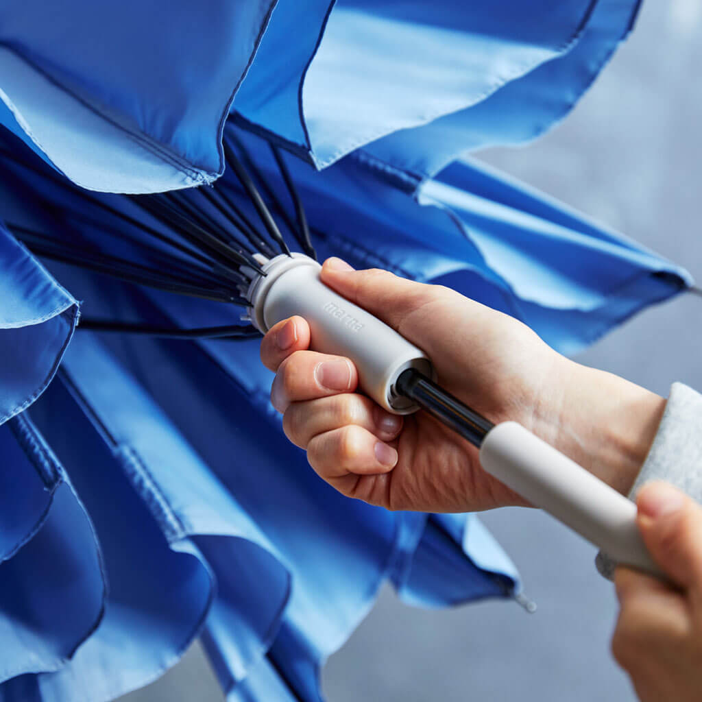 Paragüas de la marca Shupatto, con el sistema patentado de cierre en vertical y sin necesidad de correa de ajuste.