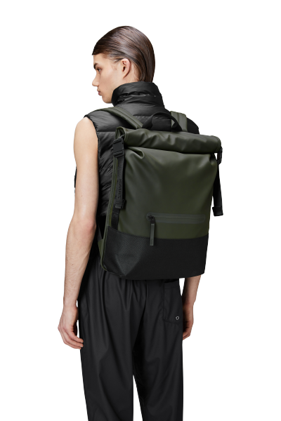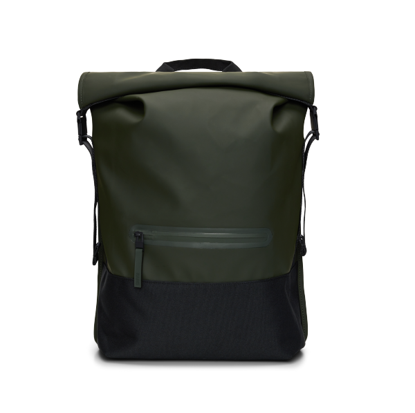Mochila Rains trail rolltop green.Trail Rolltop Backpack es una pieza básica para vivir la ciudad: perfecta para los desplazamientos urbanos en bici o a pie. Su silueta se caracteriza por sus hebillas, con el diseño propio de Rains, montadas en los laterales y su apertura a través de la parte superior enrollable que le aporta un look deportivo y funcional. Esta mochila impermeable también incluye un bolsillo interior acolchado para el portátil, un bolsillo frontal con cremallera y un panel trasero acolchado. El diseño se completa con una correa para el pecho con hebilla que permite un ajuste seguro a prueba de cualquier tipo de desplazamiento.