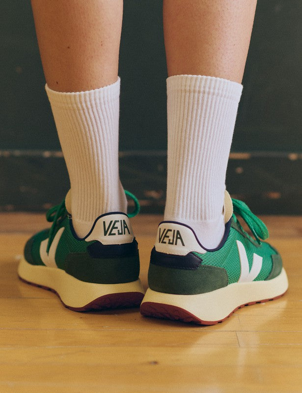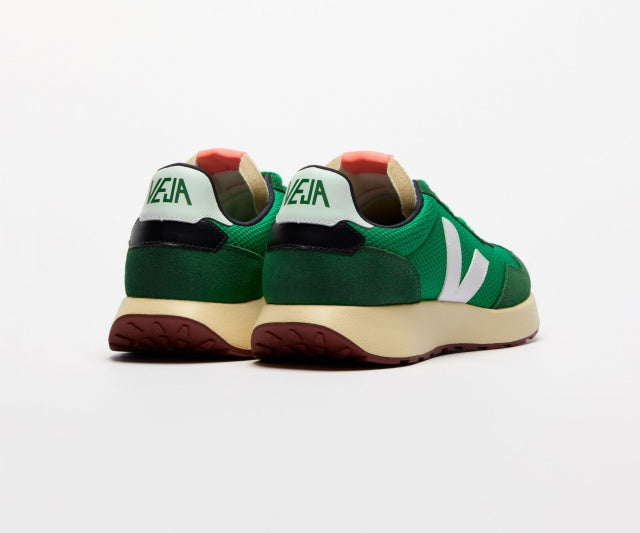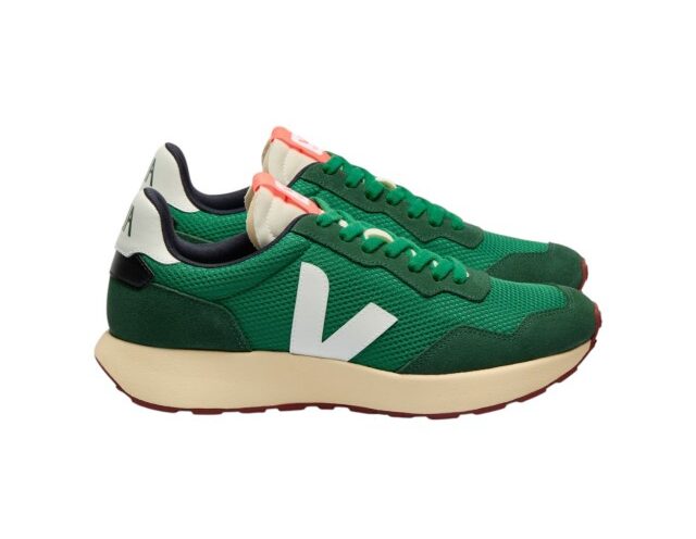VEJA utiliza algodón orgánico de Brasil y Perú para la lona y los cordones, caucho amazónico para las suelas y varios materiales innovadores hechos a base de botellas de plástico y poliéster reciclado.