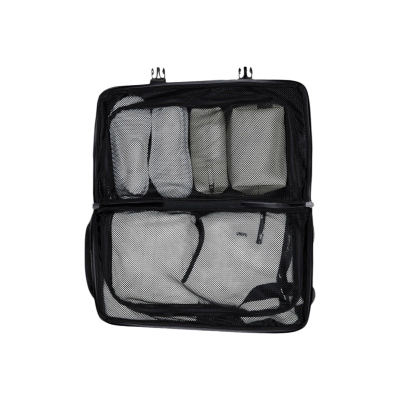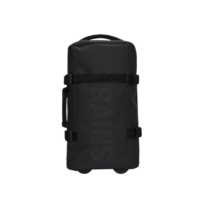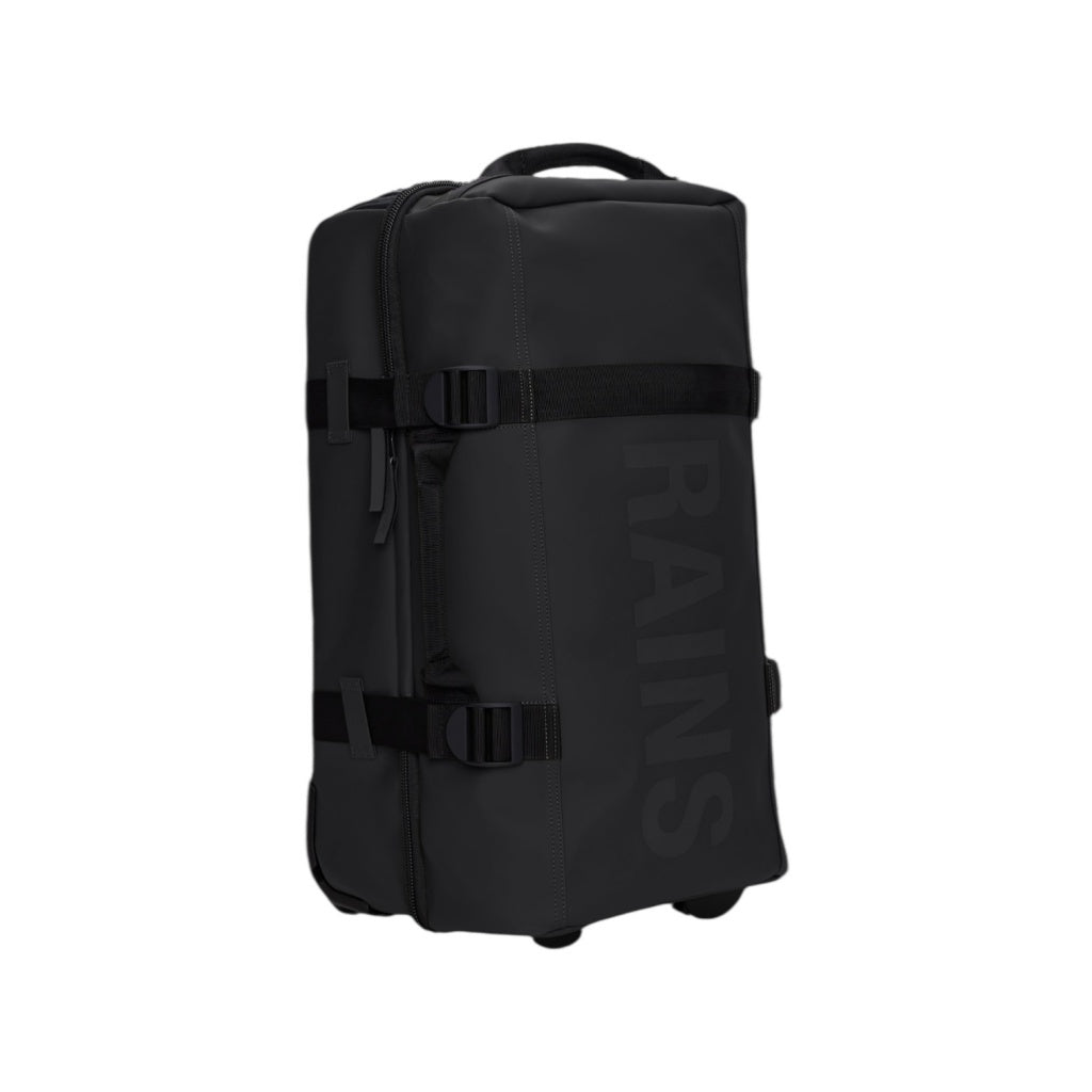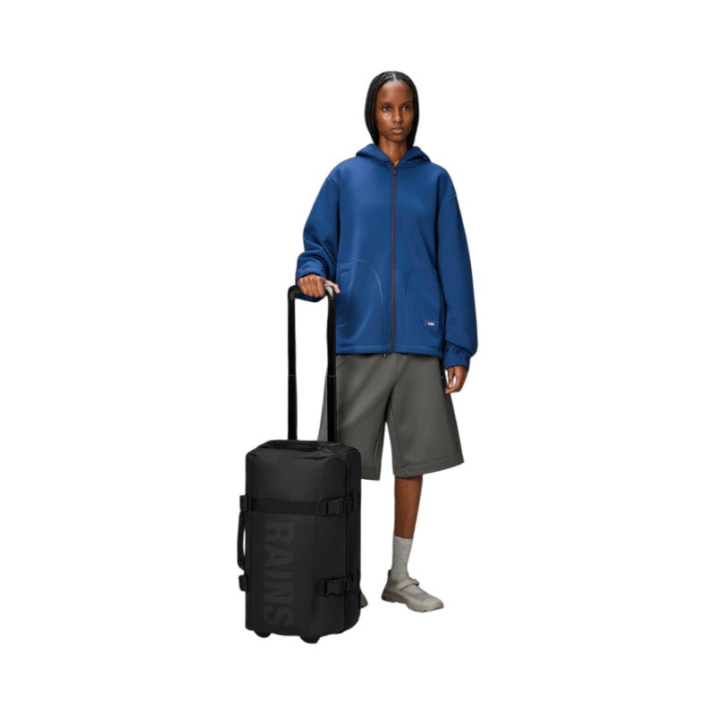 Rains Texel Cabin black travel bag The Rains Texel Cabin Black travel bag is a trolley bag with carry-on dimensions, perfect for travel. Made from waterproof PU fabric, it's designed to repel water. Its dimensions meet the carry-on requirements of most airlines, making it ideal for travel. The bag opens like a book and features two main compartments, one secured with elastic bands and both with mesh covers.
