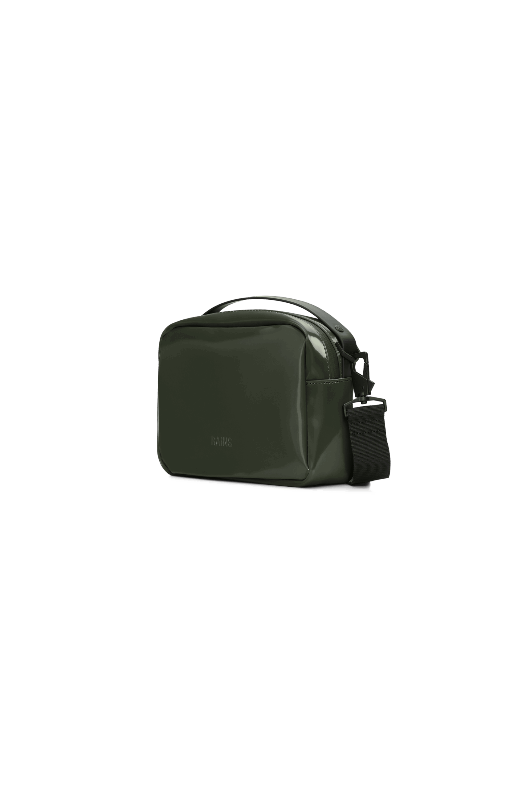 The Box Bag Rains W3 swamp is a clean yet functional bag. Designed with a minimalist, square silhouette, it offers multiple carrying options. The Box Bag features a single main compartment with a covered zip closure for easy access. Its size is ideal for carrying an extra layer and everyday essentials. This design lives up to its square name, offering multiple styling and carrying options. Wear it over your shoulder, as a crossbody bag, or as a handbag. It's finished with an adjustable and detachable webbing shoulder strap.