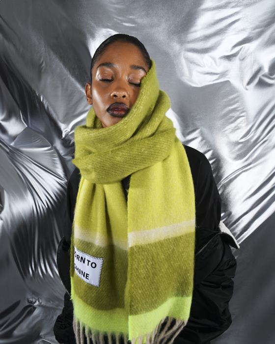 Scarf born to shine verb to do IDENTITY , each of our models features a patch with a phrase that will fill you with good vibes, attached to the garment with twisted cotton threads made up of 5 inseparable strands so that it never loses the essence that characterizes it so much Scarf born to shine verb to do