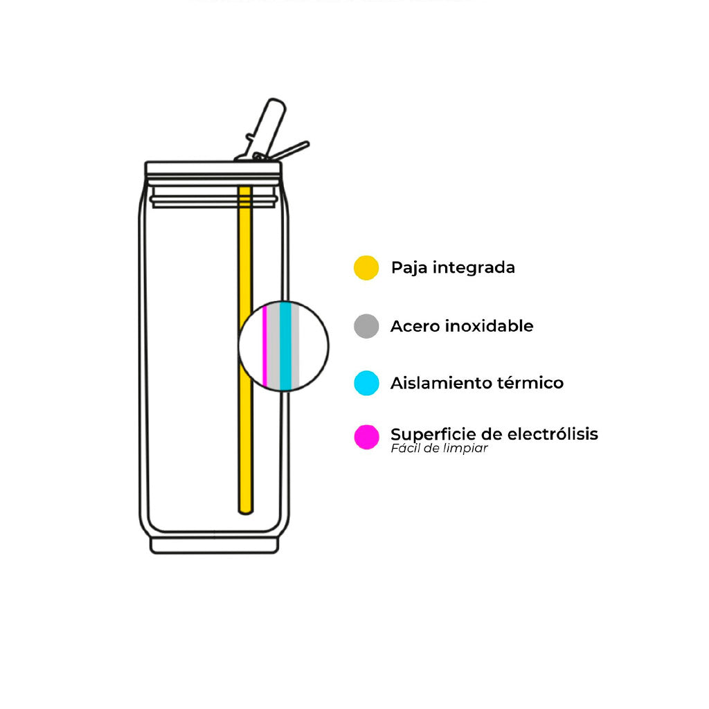 Pull Can'IT is a 280ml thermal bottle designed to resemble a can. Its double-walled stainless steel construction keeps drinks cold for up to 10 hours and hot for up to 5 hours without altering the taste. The silicone seal on the lid and the retractable spout ensure a perfect seal. The metal ring makes it easy to open, the design allows for easy insertion of ice cubes, and the included straw makes it simple and fun to use.