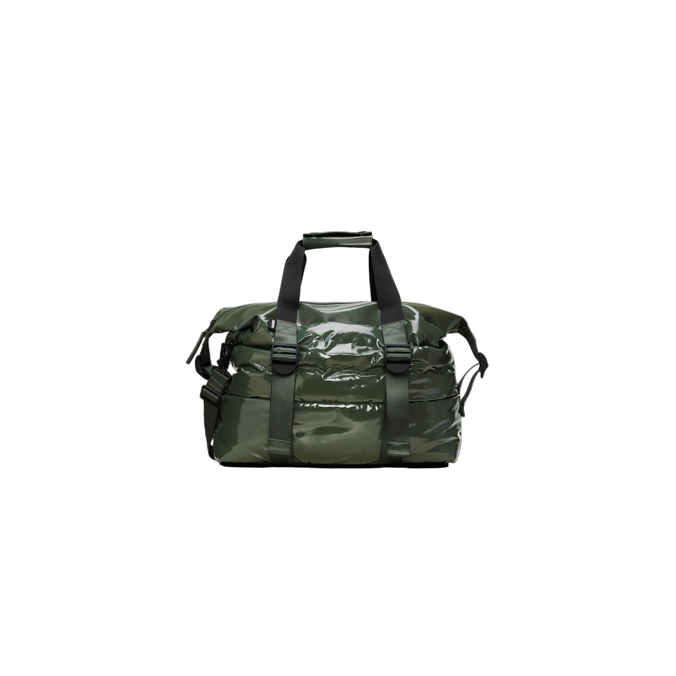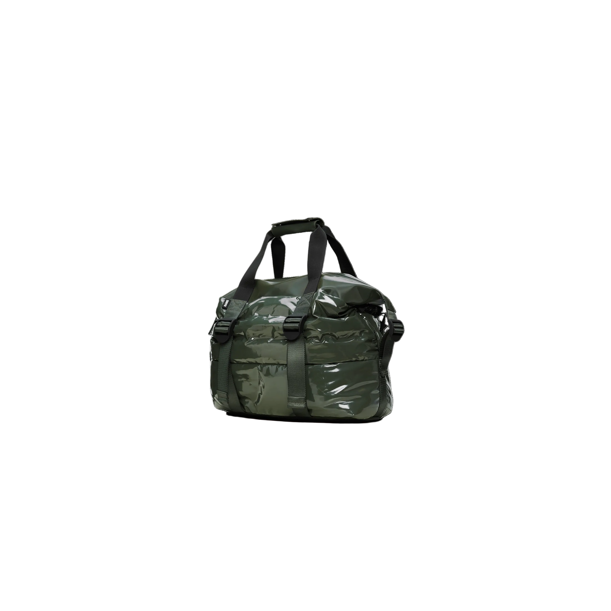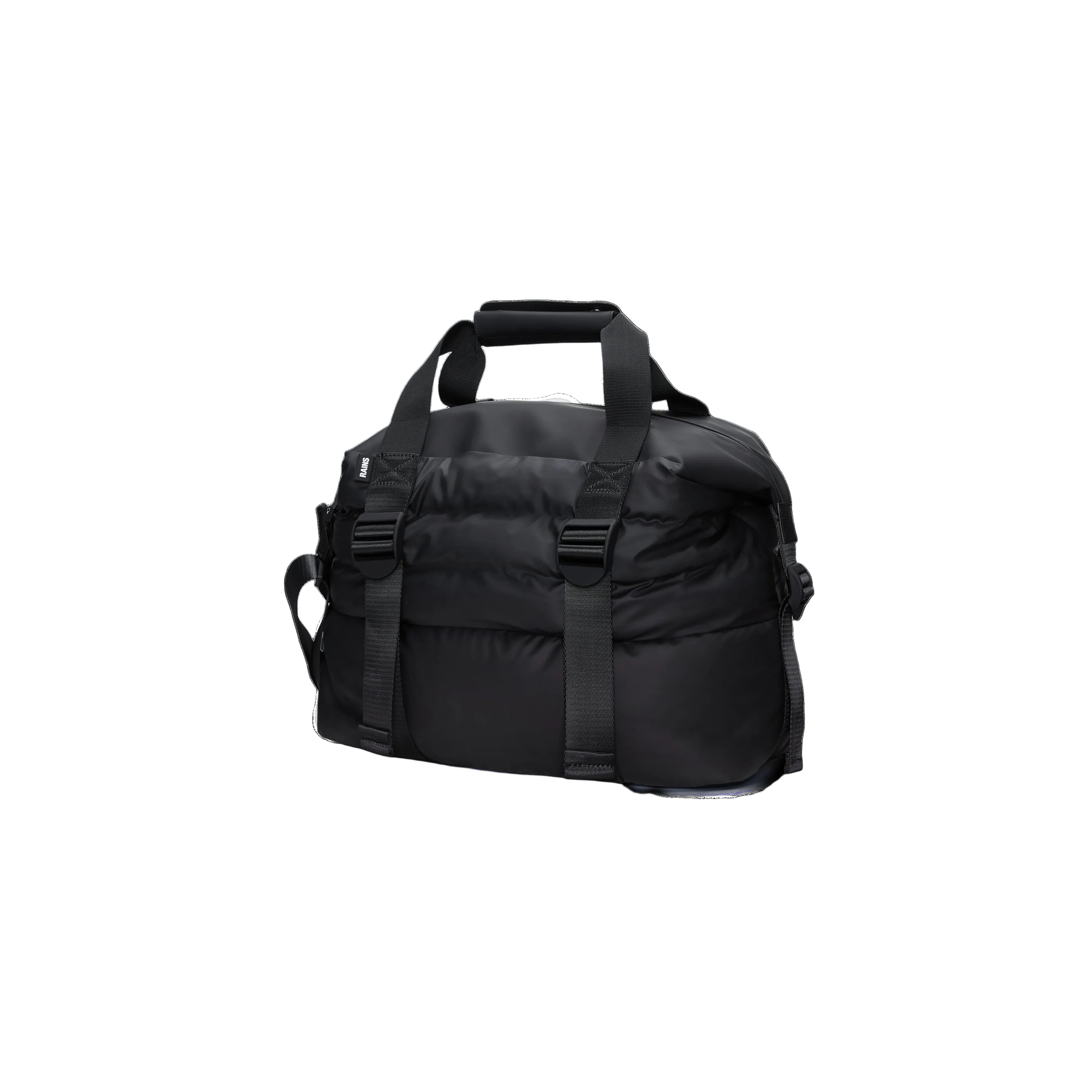 The Puffer Mix Weekend Bag Small is a redesigned version of the classic Hilo Weekend Bag. This playful design features a spacious main compartment with room for clothing, tech, and more, and an internal zip pocket for smaller valuables. On the outside, adjustable front straps provide additional storage space. It's the perfect overnight bag for traveling light. The Puffer Mix Weekend Bag Small is finished with webbing carry handles and attachment rings for an included detachable shoulder strap. Once packed, secure your belongings using the side-mounted compression straps. The Puffer Mix Weekend Bag Small combines the iconic aesthetic of quilted backpacks with Rains' renowned functionality and durability. It's made from Rains' signature waterproof PU fabric, designed for both durability and a soft feel.