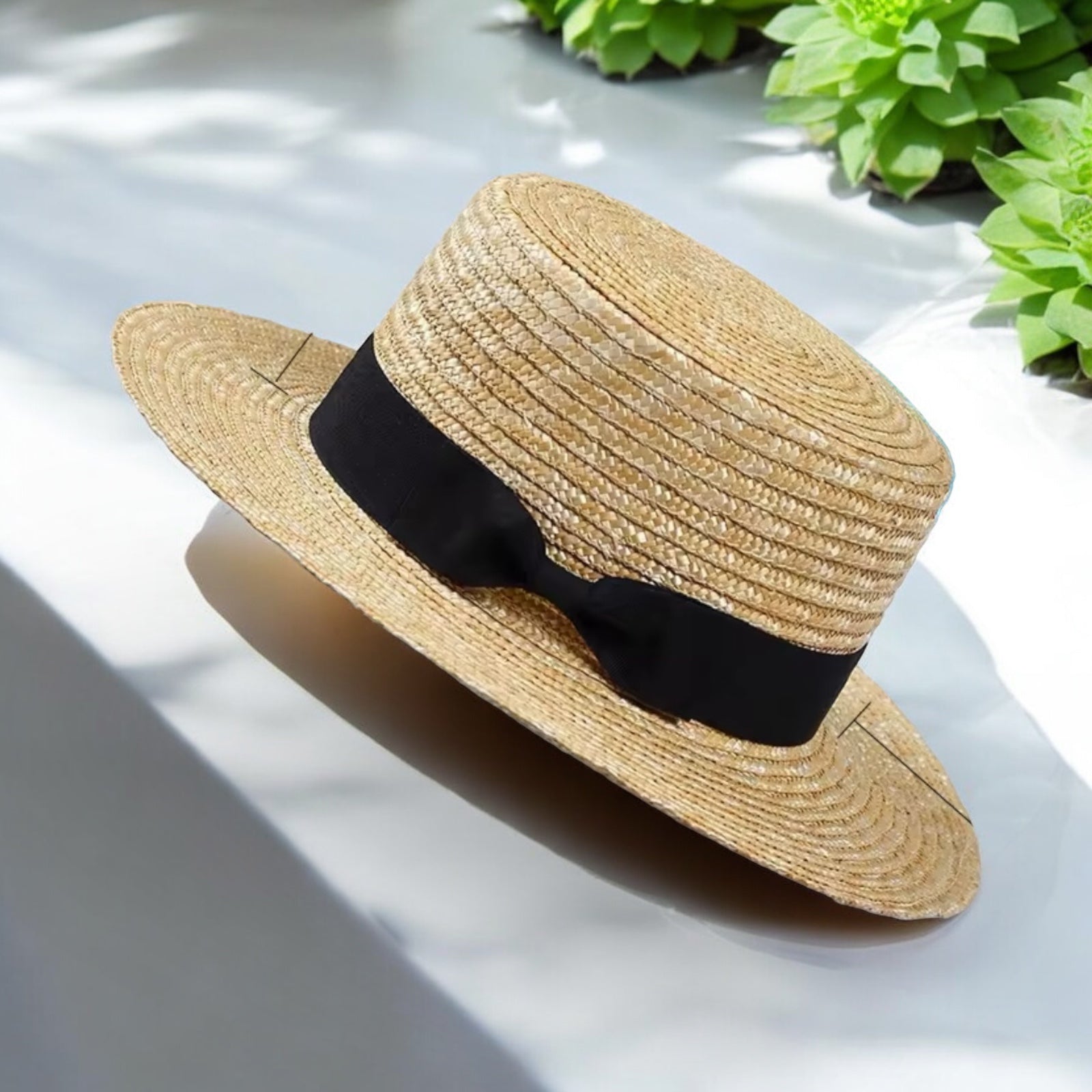 synthetic straw boater hat The straw hat is a must-have for every woman looking for a stylish yet practical headwear piece. Made from quality synthetic straw, it offers excellent breathability while protecting you from the sun. The black rep band with a logo pin adds a touch of elegance and makes it a real eye-catcher. One size fits most (approximately 55-58 cm), this hat is suitable for almost any head shape. Whether strolling along the beach or wandering through town, the straw hat is the perfect companion for any occasion. This beautiful Venetian-style hat with its rounded shape creates a nautical look. Ideal for the summer sun. Easy-care, cool, and lightweight material. Classic, stylish, and functional.